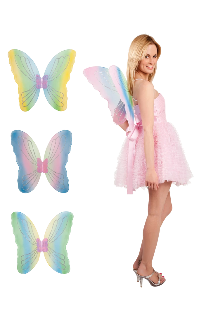 These delicate wings are made with stretch net over a delicate wire frame. The translucent background is coloured with graduated pastel shades and decorated with glitter. The wings measure 46 x 62cm and are held in place with attached elastic straps. Colours may vary to image.