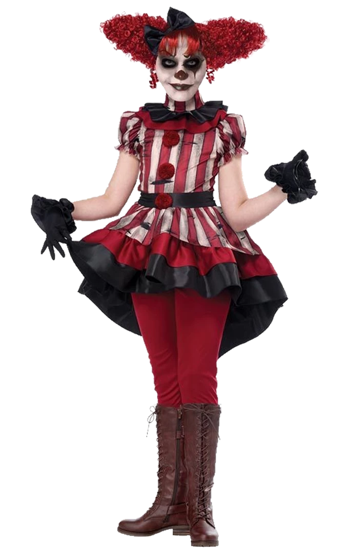 This Halloween, your little one will have the coolest kids clown costume on the street when trick-or-treating in the Kids Wicked Klown Costume. The striped top and skirt combination feature three red pom-poms, puff-ball sleeves, a black and red neck ruffled collar and a multi-layered skirt. Completing this unique look is a pair of red slim-fit trousers, a sinister clown facepiece, gloves and cuffs. It’s spooky, scary and fit for a circus princess!