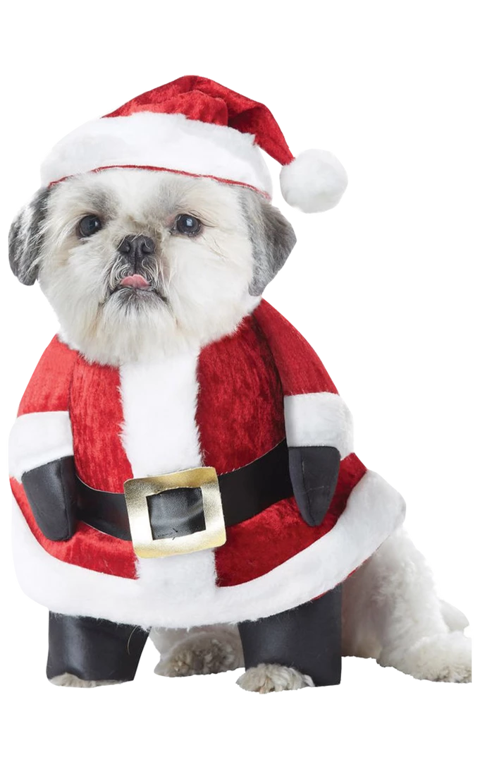 The Santa Paws Christmas Dog Costume includes an easy to wear and simple to remove Santa bodysuit with comical stuffed arms. If also features a classic Santa hat and intricate detailing of Santaโs black and gold belt.