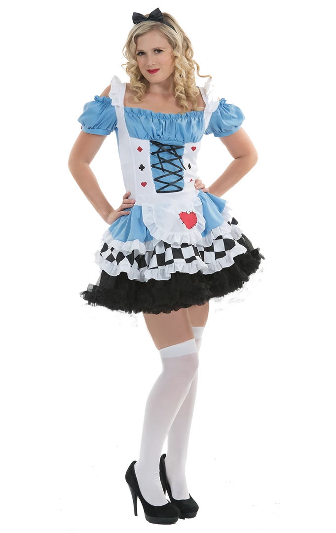 This Miss Wonderland Costume features a blue dress with off the shoulder sleeves, an attached white apron with an adjustable ribbon lace-up corset-style bodice and a chequer print skirt hem with layers of thrills and lace.