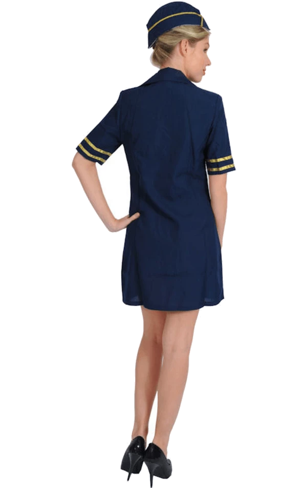 The Adult Air Hostess Costume includes a navy blue fitted dress with gold buttons. It features an aviator badge on the front, so everyone can see you are ready for business. Completing the look is a matching hat, giving you everything you need to show off the fire escapes, strut through the terminals and party all night long.