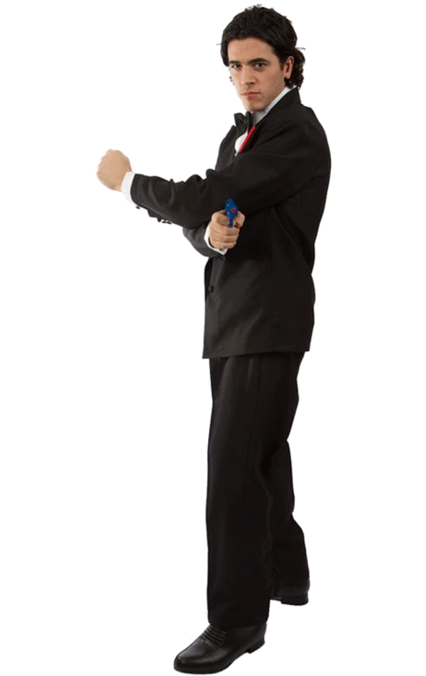 The Adult James Bond Costume includes a black suit jacket with an attached mock white. It also features a red handkerchief and a black bow tie, as well as a pair of matching trousers. Your suave 007 look will be complete in a matter of minutes. All you need extra is a fake gun.