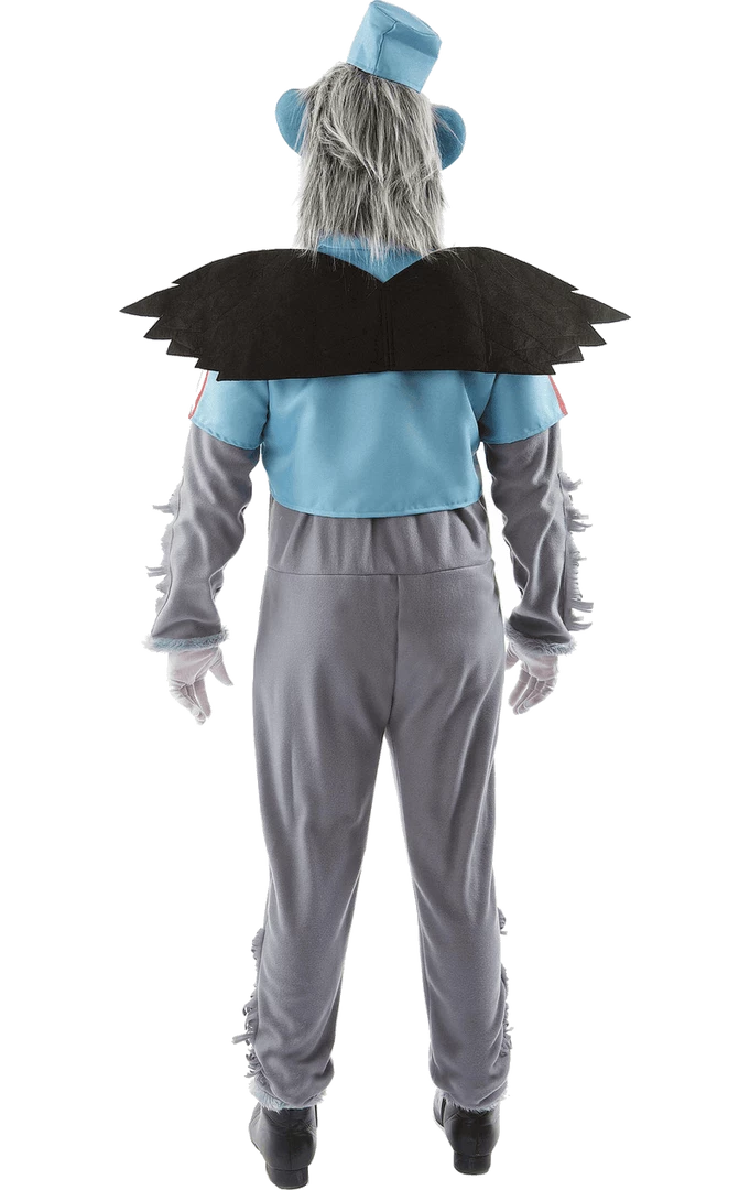 The Adult Wizard of Oz Flying Monkey Costume is made up of an all-in-one fleece grey jumpsuit with the famous red, white, and blue patterned top, as seen in the movie. It also includes a set of detachable wings that connect to the back of the outfit.