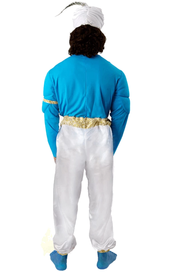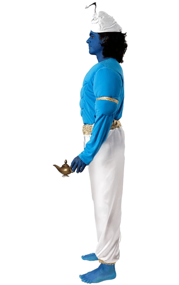 The Adult Movie Genie Costume is made up of a blue and white bodysuit with intricate gold detailing around the waist and cuffs of the trousers. The costume also includes a valiant muscle chest to give you the ultimate ripped physique. Competing the magical look is a white turban with a gold embellishment, plus a feather, so you can look like the fabulous Genie himself.