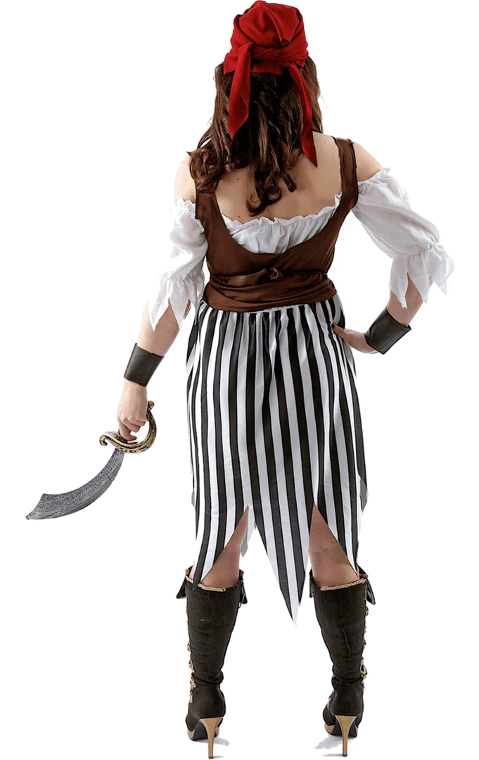 The Ladies Pirate Jailbird Costume is made up of an incredible classic pirate dress with a black and white striped skirt. It features red detailing down the front, a brown corset style top, a matching red bandana and brown wrist cuffs.