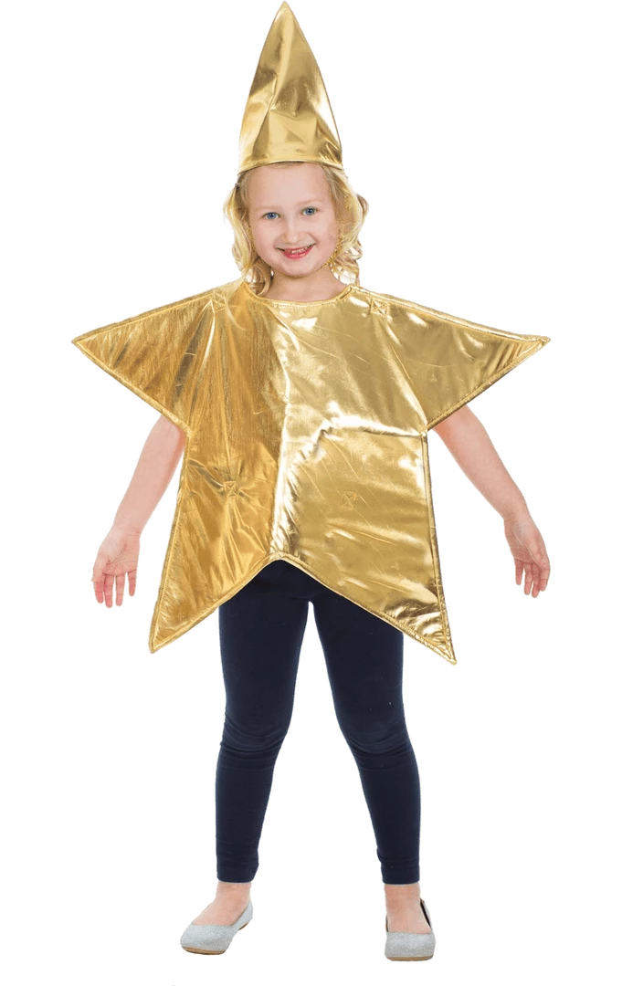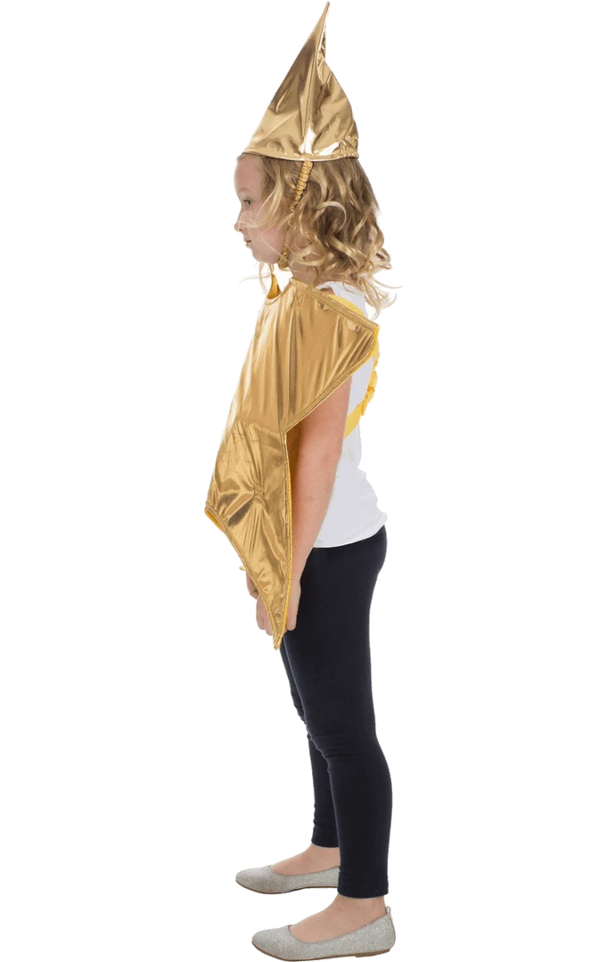 The Kid’s Gold Star Christmas Costume is made up of sparkling star shaped tunic that slides over the head. A gold hat then completes the point of the star.