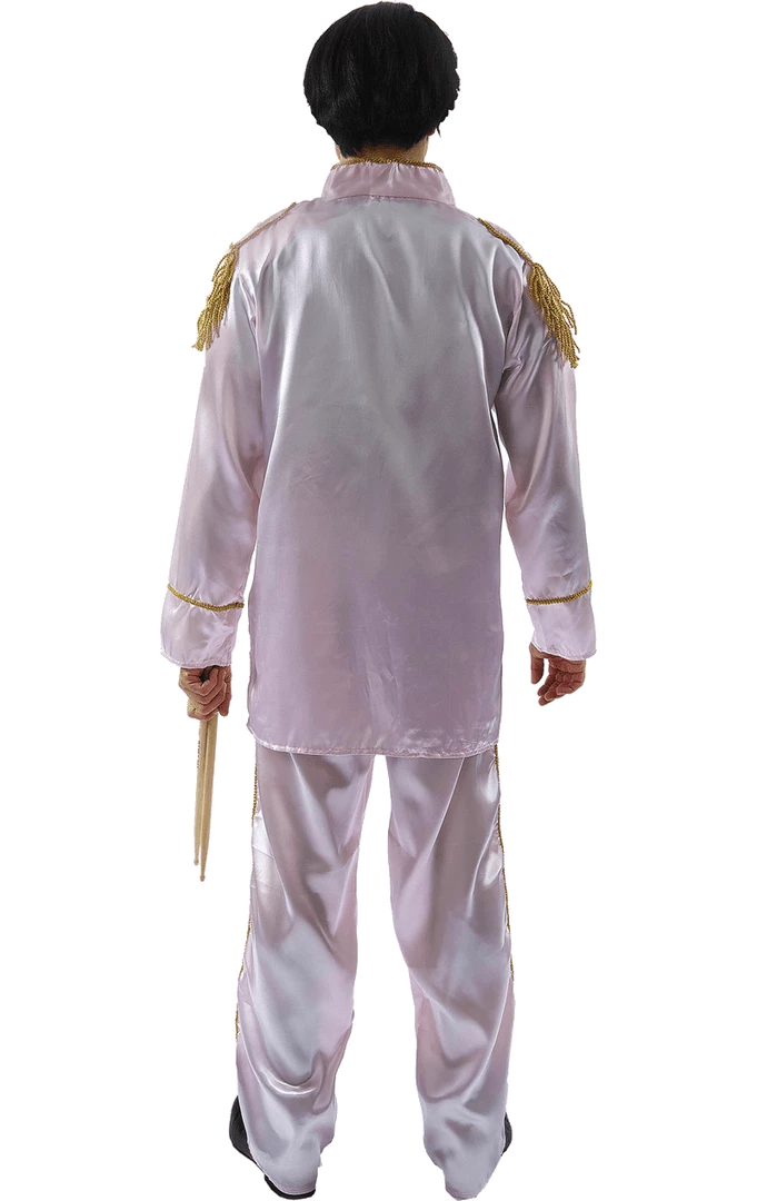 The George Harrison Beatles Costume is made up of a long, satin, military-style suit jacket. It’s in a retro shade of pale pink, with a high collar and gold detailing on the front, shoulder pads with a gold tassel trim, and metallic gold rope details down the centre. The costume also comes with a matching pair of satin-style pink trousers with an elasticated waistline, for a flexible and comfortable fit.
