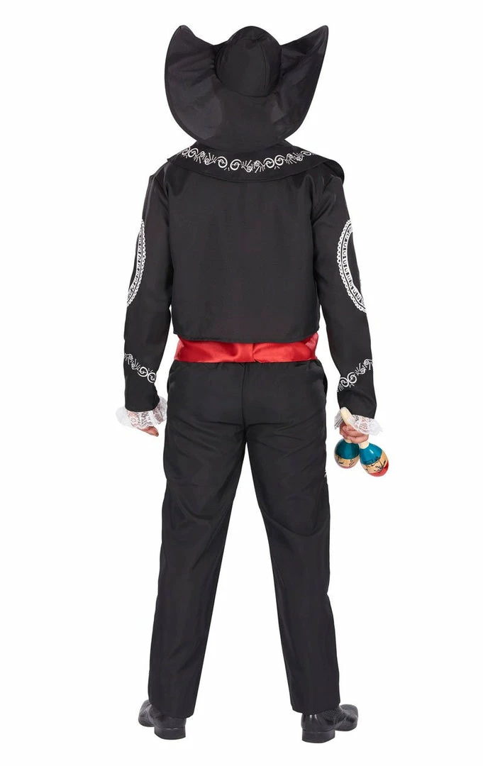The Mens Mexican Mariachi costume is made up of a matching three-piece suit with jacket, trousers and a vest with attached shirt front, sash and tie. A classic Mariachi hat completes the costume. All you need to finish the look is a set of maracas and a musical instrument of choice.