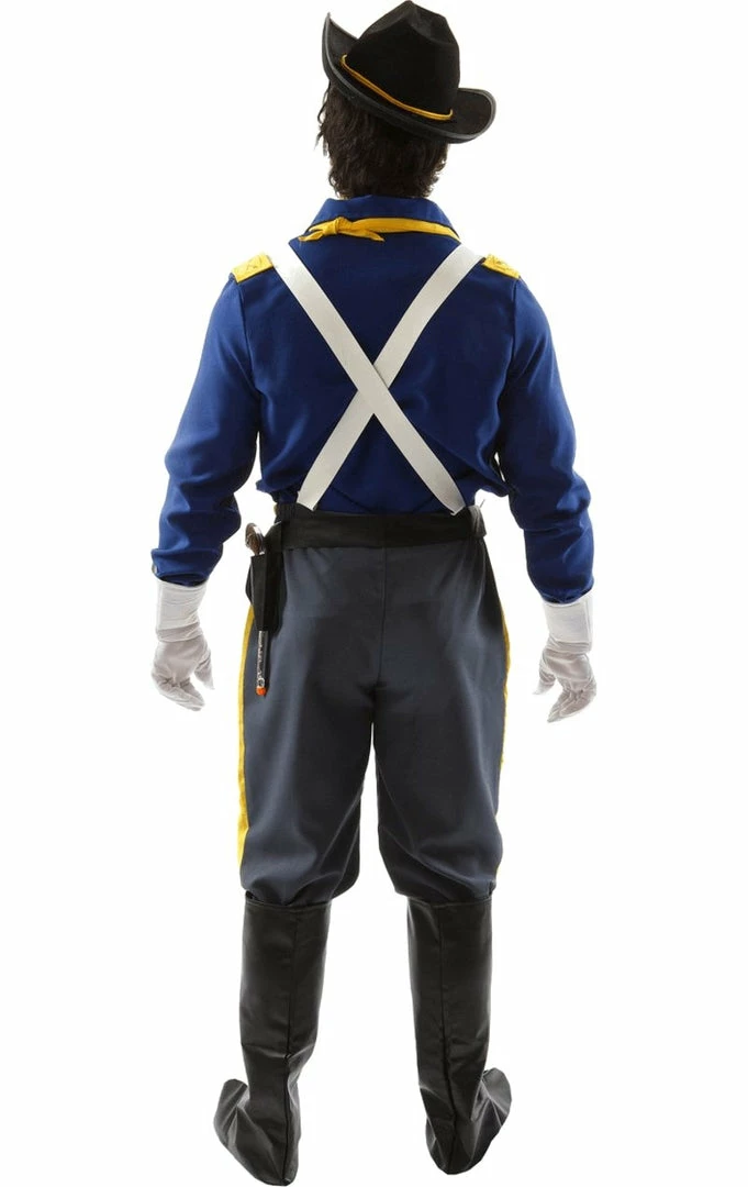 The US Cavalry Costume is made up of a royal blue shirt, navy trousers with yellow stripes down the side, and an attached pair of white braces. The costume also includes a yellow neck scarf, black belt, boot covers and a pair of white gauntlets. You’ll have everything you need to defend your nation and go on your next adventure exploring the US frontier.