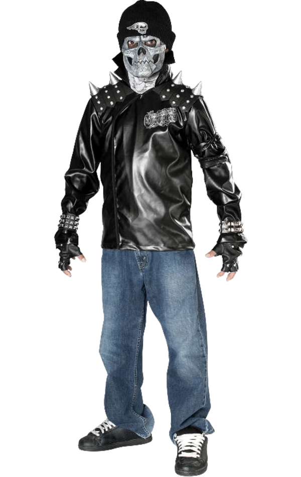 Turn up to the Halloween party revving your engine, everyone will turn to look at the coolest ghoul who has just arrived! Your child will love the Kids Death Skull Biker Costume for trick-or-treating. It features a metal look skull facepiece with an attached beanie hat, as well as a leather look studded biker jacket and fingerless gloves. Your little one is sure to collect all of the best sweets when out on Halloween when wearing this rocking outfit!