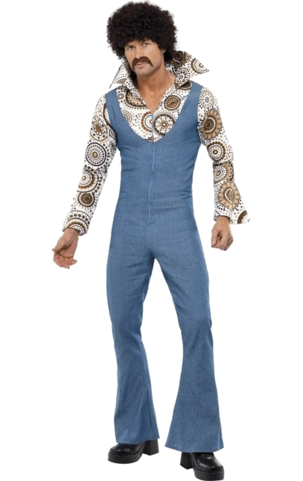 The Groovy Dance Costume includes a denim look, all-in-one, fitted blue jumpsuit with flared legs. It also features an attached brown and white retro patterned shirt with an oversized collar.