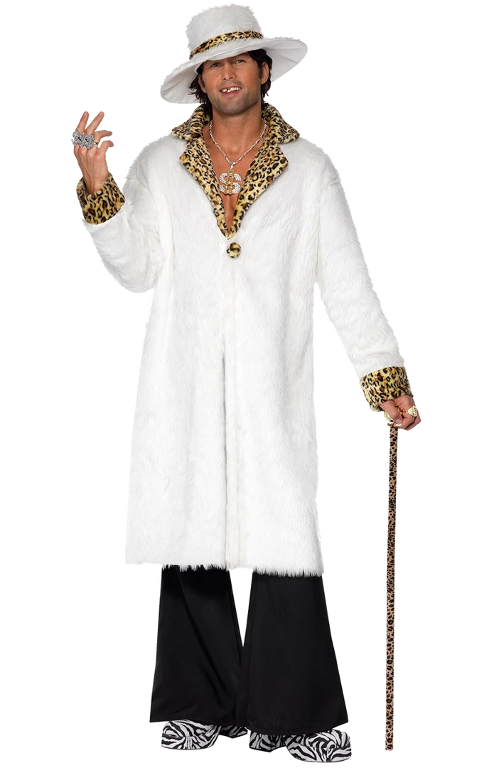 Pimp costumes don’t get more pimptastic than this Christmas snow themed furry white number, complete with leopard print trim, matching hat and even a pair of black flares! Feel those 70s vibes as you hang out in the nightclub with your honeys. Complete your look with a dollar sign necklace across your hairy chest and some gold signet rings!