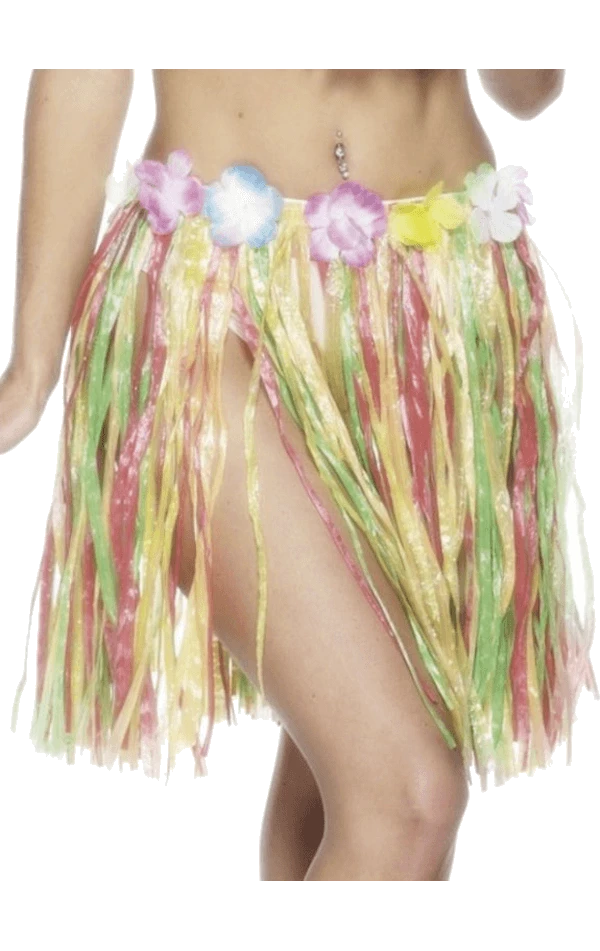 This multi coloured hula skirt with flowers is 46cm in length is made of strands of fiber in pink, yellow and green.