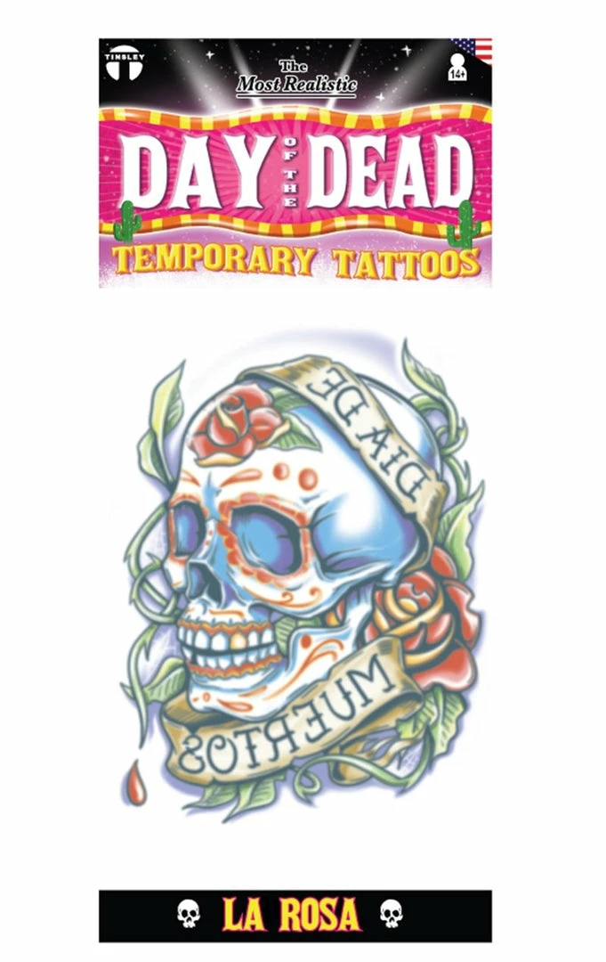 Add flair to your next Halloween costume with this unique fake tattoo! The La Rosa Sugar Skull Tattoo FX transfer allows you to show off your new body art without the commitment of a real tat! Perfect for Halloween, this floral sugar skull tattoo will compliment your Day of the Dead costume perfectly. It’s so easy to apply, just use water!