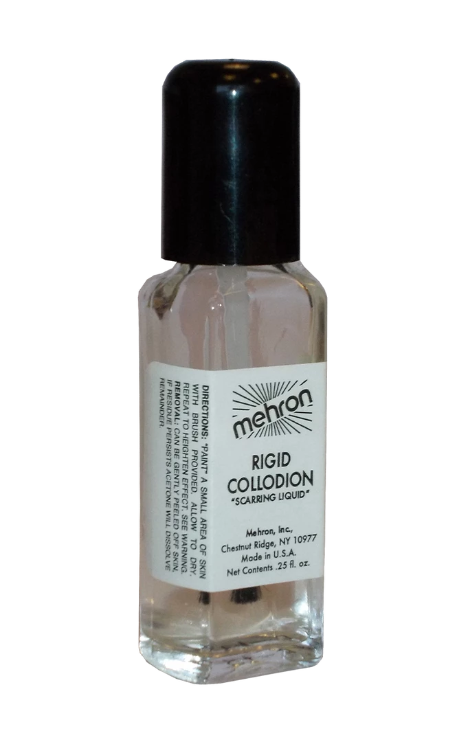 The Rigid Collodion & Brush has been a secret for make up artists to the stars for many years, creating realistic scars and scratches in big blockbuster films. Now you can bring a bit of movie magic to your costume too, simply apply liquid to a small area of the skin and repeat to heighten effect, application brush attached to cap for easy use. Use make-up to give appearance of swollen or inflamed skin and gently peel from skin to remove. Bottle .25 fl oz.